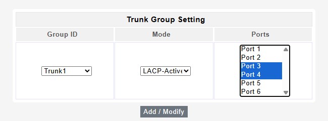 Di halaman Configuration > Trunk Group Setting, buat Trunk Group yang minimal berisi 2 buah port, seperti contoh berikut: