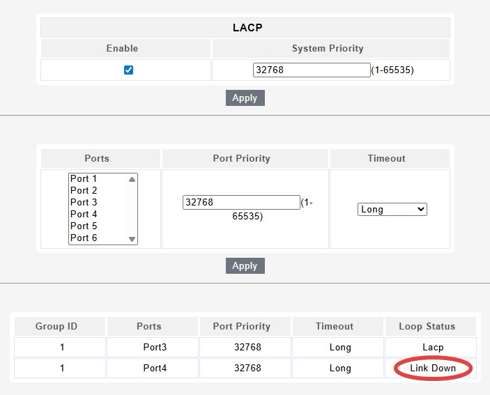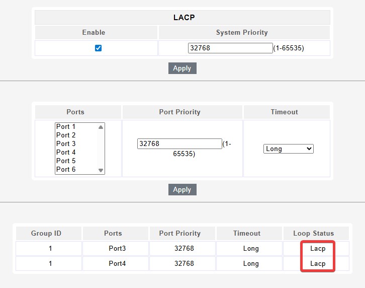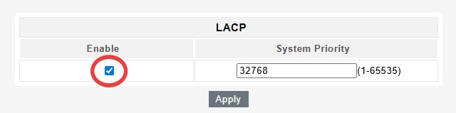 Di halaman Configuration > LACP, LACP Enable : Checked lalu Apply