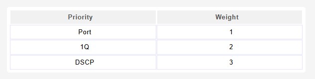 Kami menyarankan penggunaan spesifik to broad approach, yaitu DSCP (software -specific) dengan prioritas tertinggi / 3, dilanjutkan dengan 1Q (VLAN-specific) di prioritas kedua (2), dan terakhir port di prioritas ter-rendah (1)